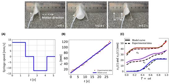 The single-actuator version performs straight motion, so the results reported in Figure 11 recall this scenario. Two key aspects emerged from this experiment. First, the robot maintained a straight trajectory characterized by reasonably constant velocity even without feedback control (the open-loop command, namely the syringe velocity, is shown). The robot position has been extrapolated from video frames and plotted (a few examples are reported in the upper portion). The resulting linear fitting has an angular coefficient equal to 3.94 mm/s, which is the average robot velocity for the entire test duration. The robot crawled on a foam pad characterized by a slightly uneven surface, so the consistency of the motion and the straight trajectory are relevant achievements. Second, there is a good overlap between the measurements and the model prediction proposed in Section 3.1. The position of the robot extremities is illustrated for one pumping cycle of the power supply that lasts 5.2 s (this scenario refers to inflating and deflating the soft actuator once). The robot’s corresponding stride is about 20 mm.