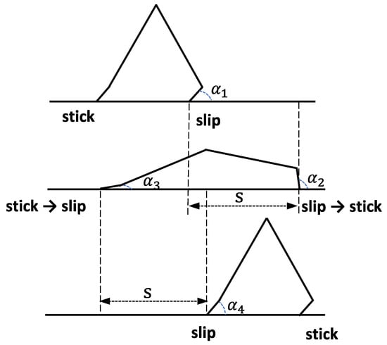 These experimental observations support the understanding of the crawling mechanism for such robots. As the soft actuator undergoes expansion so that the joint angle increases (left-hand side of Figure A3), the angle of attack  at the robot’s rear end is larger than  at the front end. Thus, the rear friction force  is higher than , causing stick at the rear extremity and slip at the front one (i.e., the robot moves forward by “flattening” toward the ground). This friction condition is valid for the entire range of motion when  increases (we have estimated the variation of the attach angles assuming a constant angle between the main robot segment and the bent extremity with serrated edge, reasonable results according to our observations). As the soft actuator deflates, reducing, therefore, the joint angle (right-hand side of Figure A3), the friction conditions at the interfaces change. The attack angle  at the rear end is smaller than  at the front end (it is worth noting that the angles of interest are now different due to the modified motion direction of the robot extremities). Thus, the rear friction force  is smaller than , resulting in stick at the front extremity and slip at the rear one (i.e., the robot “gets up” from the ground).