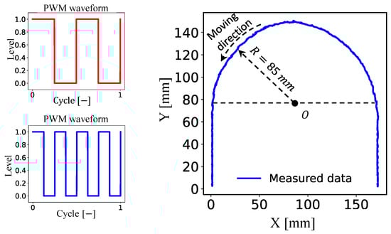 Testing of the dual-actuator robot along a U-shaped path: PWM input commands given to the electro-pneumatic power supplies and resulting robot motion.