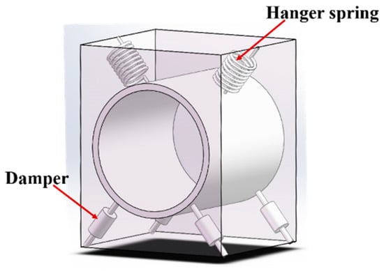 When a drum washing machine operates at high frequencies, the body vibrates severely, especially with only a small amount of clothing to dewater. The high-speed rotation of the eccentric system exacerbates system instability, while the existing vibration damping system, which consists of hanger springs and dampers (shown in Figure 1), fails to block the vibration transmission path effectively. Severe vibration not only interferes with the regular washing program but also wears down and damages the suspension system, shortening its lifespan. Solid-state friction dampers are widely employed in drum washers, accomplished by friction between the guide rod and ring. With the operating frequency increasing, the apparent elastic coefficient of the solid-state friction damper increases dramatically while the displacement decreases simultaneously. According to the amount of energy lost proportional to the relative moving distance between the two components, the vibration-damping performance is significantly reduced during dewatering.