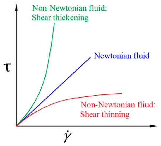 A non-Newtonian fluid damper is another type of vibration and shock damper commonly employed in vibration and shock situations, such as high-rise buildings, structural earthquakes, bridges, industrial pipe equipment earthquakes, ships, boats, etc. [14,15,16,17,18,19]. Given that the pseudoplastic fluid has the property of shear thinning (the shear stress increases slowly, and viscosity decreases rapidly with increasing frequency), as depicted by the red curve in Figure 2, it is anticipated that the pseudoplastic fluid damper will effectively overcome the shortcomings of inefficiency damping performance vibration in high-frequency friction dampers. The vibration impact force and amplitude of washing machines are much smaller than those of ships, buildings, and other large structures. Therefore, a novel kind of low to medium viscosity pseudoplastic non-Newtonian fluid damper is investigated in this work.