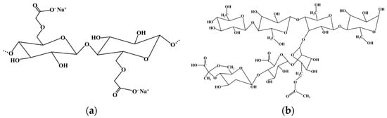 Carboxymethyl cellulose and xanthan gum are the primary components of the pseudoplastic fluid. Carboxymethyl cellulose (CMC) is an essential water-soluble cellulose ether [20]. Xanthan gum is an anionic extracellular polysaccharide extracted from Xanthomonas sp. [21]. Numerous hydrophilic groups, such as hydroxyl, acetyl, and pyruvic acid groups, are present in their molecules (Figure 3), and solid intermolecular hydrogen bonding significantly improves the viscosity and stability of the solution when dissolved in water [22,23,24]. Even at low concentrations of the polysaccharides, the CMC main chain has a significant amount of carboxymethyl groups [25], commonly used as cross-linking agents to create hydrogels. The xanthan gum chain structure undergoes an ordered-disordered transition from a helical to a coiled structure when dissolved at high temperatures, making it easier for the CMC side chains to cross-link. At the same time, CMC and XG also interact with each other, resulting in the high viscosity of the combined solution [26].
