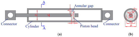 As shown in Figure 4, is the cylinder bore diameter, is the diameter of the piston head, is the actuator diameter, is the gap height, and is the radius of the center ring of the gap. The flow rate of fluid was calculated within the range of . The viscous fluid flows in a circular tube in a laminar manner, and the velocity distribution is a rotating paraboloid. Therefore, the boundary conditions are introduced as follows: