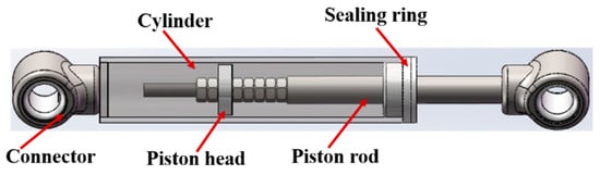 The non-Newtonian fluid variable damping damper is depicted schematically in Figure 6 as a single-cavity construction with the piston head, the fluid cylinder, the sealing ring, the piston rod, and the connector. The damper’s principal structural dimensions are listed in Table 2.