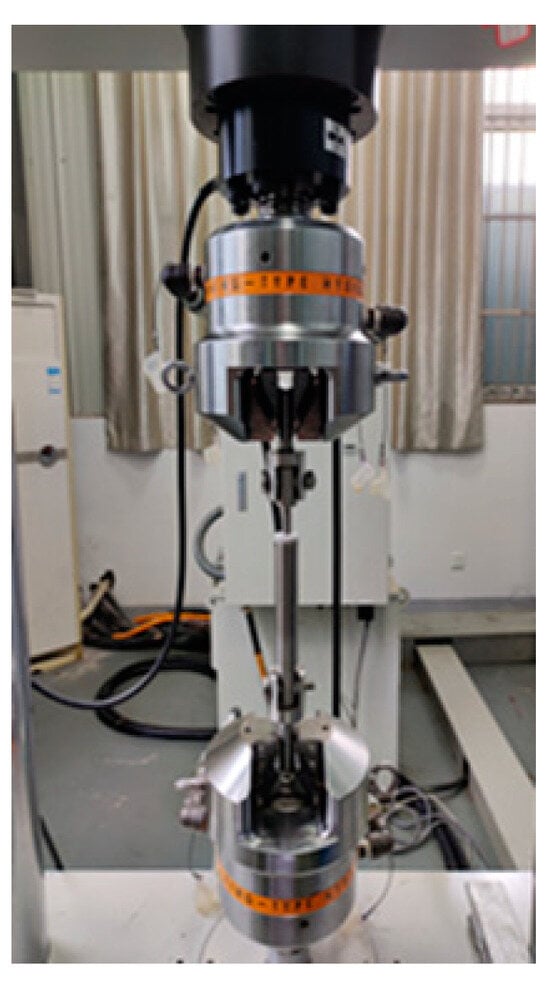 The mechanical properties of the damper were tested using the Shimadzu EHF-E electro-hydraulic servo fatigue testing machine, as shown in Figure 7. When the washing machine’s vibration frequency was examined, it was found that the usual washing frequency was around 6 Hz, and the average spinning frequency was approximately 10–13 Hz. Based on this frequency range, the mechanical properties of the original solid-state friction damper and fluid damper (damping head diameter of 18.4 mm, number of damping heads of 4, and damping fluid ρ(p) = 2.0 g/L) were tested at frequencies of 1 Hz, 5 Hz, and 10 Hz, with a displacement amplitude of ±5 mm, at room temperature of 20 °C.
