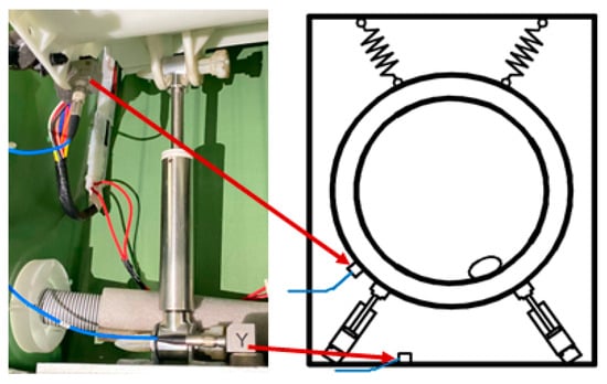 The washing machine for this experiment is a Swan drum washer (TD100VT096WDG) manufactured by Midea (Foshan, China), with a washing load of 10 kg. The suspended drum is connected to the top of the casing by two hanger springs above it, and the bottom of the suspended drum is connected to the bottom of the casing by four vibration dampers. The drum has a maximum speed of 1400 rpm and may rotate clockwise and counterclockwise. The drum only moves in a circular motion while spinning under balanced load circumstances [33]. An uneven load causes certain lateral and vertical motions of the inner cylinder to be transmitted to the outer surface of the machine through the action of springs and dampers, which is the primary cause of vibration.