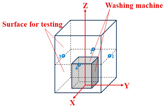 Instantaneous noise levels under machine operating conditions were collected using an AR844 Noise Meter, and the average sound pressure level values of the noise using fluid dampers and solid-state friction dampers were calculated. Referring to GB-T4288-2003 “Domestic Electric Washing Machine”, the test was carried out in a semi-anechoic chamber, as shown in Figure 9; the numbers 1~4 are the placement positions of the noise meter microphone, with the center point at the bottom of the washing machine as the origin (0, 0, 0), according to the outer dimensions of the washing machine, the coordinates of the four points from 1 to 4 are calculated as (0, 1.2975, 0.925), (−1.265, 0, 0, 0.925), (0, −1.2975, 0, 0.925) and (1.265, 0, 0.925), respectively. 0.925), (0, −1.2975, 0.925) and (1.265, 0, 0.925) (All dimensions in mm).