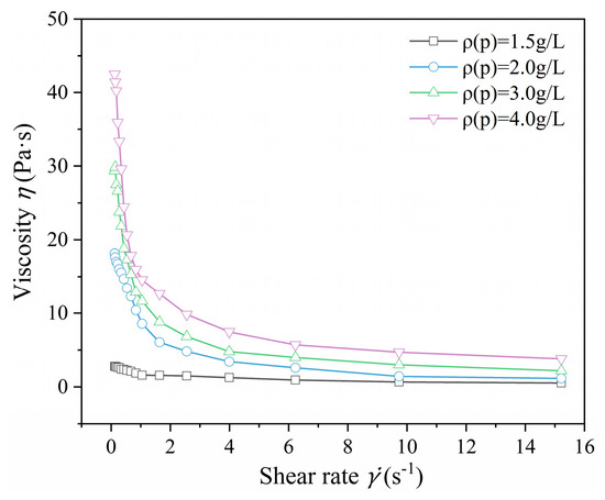 The rheological curves of the CMC/XG/B/CA crosslinked solutions were determined, where ρ(p) was 1.5 g/L, 2.0 g/L, 3.0 g/L, and 4.0 g/L. The apparent viscosity of the composite solutions rapidly drops with an increase in shear rate, as seen from the measured data in Table 3, clearly demonstrating shear-thinning features. The drum washing machine used in this experiment has a rotational speed of about 200–1400 rpm under working conditions, which is converted to a shear rate of about 2–18 s−1.