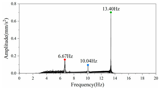 According to Figure 10, the apparent viscosity rapidly drops in the shear rate range of 1–16 s−1. Figure 11 shows the frequency domain signal of the vibration signal of the washing machine collected by the acceleration sensor. The FFT analysis shows that the regular washing frequency of the washing machine is about 6 Hz, and the dewatering frequency is about 10–13 Hz. This working frequency range corresponds to the shear-thinning rate range of the solution in Figure 10. When the rotational speed of the washing machine is gradually accelerated, the piston head of the damper accelerates under the action of the external force. The viscosity of the damping fluid in contact with it decreases so that the damping force of the damper with this damping fluid in the high-frequency operating conditions of the washing machine is significantly reduced relative to that of the low-frequency output damping force.