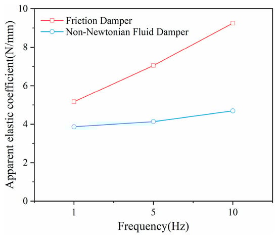 The output force-displacement relationship of the non-Newtonian fluid damper and the solid-state friction damper can be acquired by the fatigue testing machine, and the apparent elastic coefficient of the damper can be defined by the ratio of the maximum values of the force and displacement. Figure 12 displays the two types of dampers’ apparent elastic coefficients about the test frequency. Under constant amplitude ± 5 mm, the solid-state friction damper has a stiffer structure than the non-Newtonian fluid damper because of its higher output force. The stiffness of solid-state friction dampers rises considerably as frequency increases, whereas non-Newtonian fluid dampers barely change with frequency. Therefore, non-Newtonian fluid dampers can effectively overcome the defects of solid-state friction dampers at high frequencies due to the decrease in viscosity.