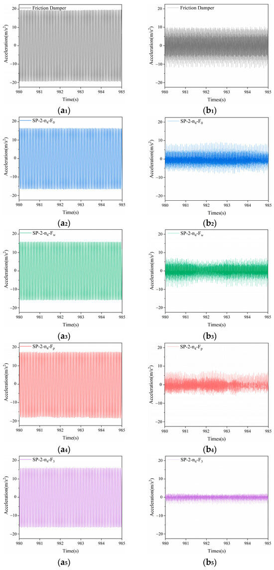 Figure 17 shows the comparison of vibration acceleration of SP-1--F2 and SP-2--F2 in the dewatering stage. The vibration acceleration values at the top of the z-direction for specimens SP-1--F2 and SP-2--F2 are shown in the figure to be reasonably close to each other. However, the vibration amplitude at the bottom of SP-1--F2 is reduced by more than 50% when compared to the Figure 13a solid-state friction type. When the diameter of the damping head increases from 18.4 mm to 18.8 mm, i.e., the height of the gap decreases, the damping force increases, and the acceleration further decreases, the acceleration amplitude at the bottom of the specimen SP-2--F2 is only equivalent to 35% of that of the solid-state friction type.
