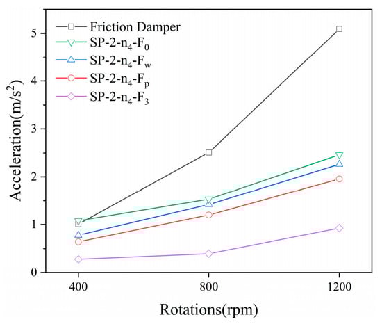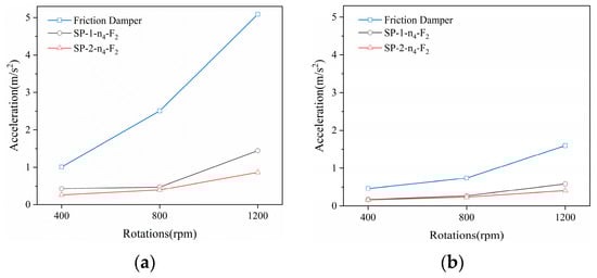 Figure 18 clearly shows that the bottom vibration acceleration of specimens SP-1--F2 and SP-2--F2 in the z and y directions is significantly smaller than that of the solid-state friction damper, acceleration value attenuation is mostly more than 62.70%, the highest reaches 84.30%. When the rotational speed is above 800 rpm, the corresponding vibration energy attenuation is more than 90%. Furthermore, it is discovered that specimen SP-2--F2 has a lower acceleration amplitude in the z and y directions than specimen SP-1--F2, with the z direction showing a more evident drop. This reduces the average acceleration of the three rotational speed phases of 39.61%, 17.00%, and 40.02%, respectively. It suggests that a slight increase in the diameter of the piston head, i.e., a reduction in the gap height, can lead to a better energy dissipation capacity and enhance the damping performance of the designed fluid damper. Comparing Figure 16, Figure 17 and Figure 18 demonstrates that the fluid dampers designed for this study consume more vibration energy at both low and high spinning frequencies than the commonly used solid-state friction damper.