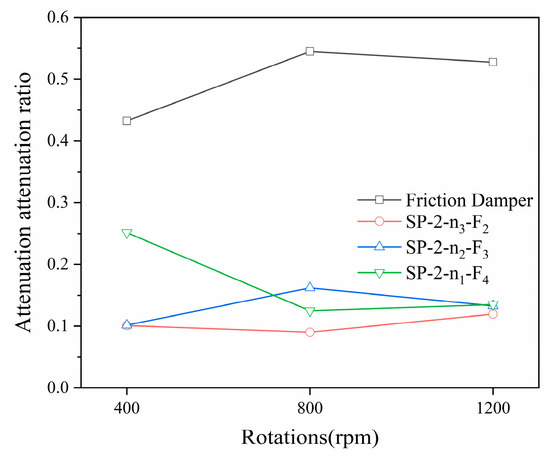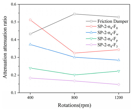 Figure 23 shows the acceleration attenuation ratio curves for the four damper types at three-speed stages. The three specimens’ attenuation ratios are significantly lower than those of the solid-state friction damper, indicating that more vibration energy is dissipated in the fluid damper and that the energy transferred to the washing machine’s surface is substantially reduced. The SP-2--F2 specimen’s is the smallest of the three specimens, with a reduction of 83.49% compared to the friction damper at 800 rpm.