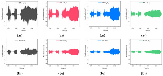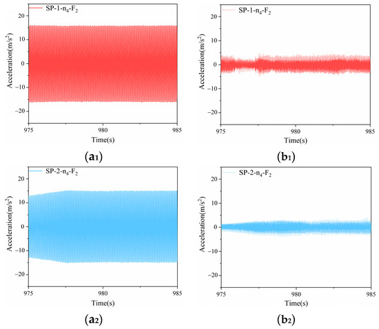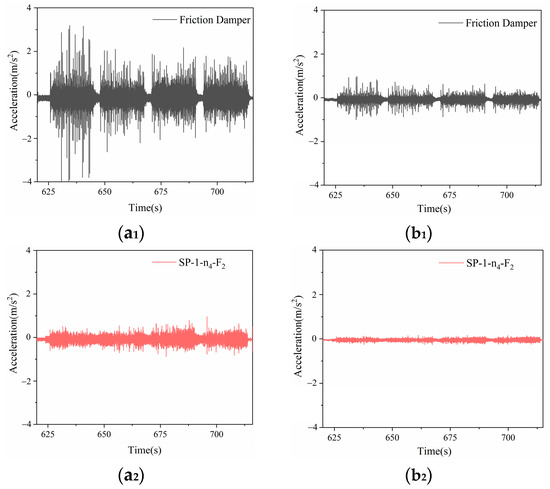 Acceleration of the dewatering stage (friction damper and specimen SP-1--F2, SP-2--F2): (a1,a2) top acceleration in the z-direction; (b1,b2) bottom acceleration in the z-direction.
