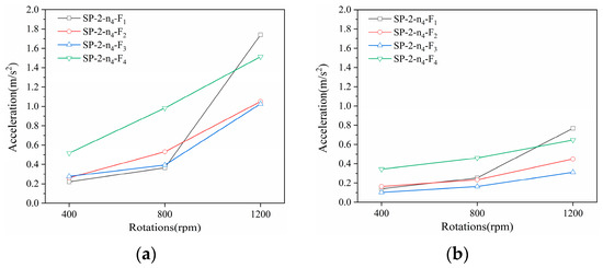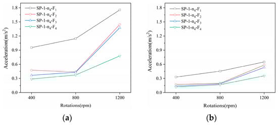 Average acceleration for three speed stages (SP-1--F2 and SP-2--F2): (a) bottom acceleration in the z-direction; (b) bottom acceleration in the y-direction.