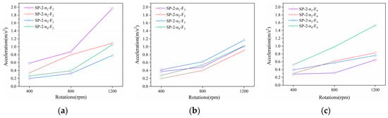 The geometries and the design parameters of the eight damper types designed for fluid viscosity are listed in Table 6. Figure 19 indicates the vibration acceleration in the z and y directions at the bottom throughout the dewatering stage. It is easy to conclude that when the diameter of the damping head is 18.4 mm, the acceleration amplitude of specimen SP-1--F4 in the z and y directions is the smallest compared to the other three during the entire dewatering process. Increasing the viscosity of the damping fluid can enhance the vibration suppression effect of the fluid damper. According to Figure 20, in comparison with SP-1--F1, the average vibration acceleration of SP-1--F4 reduces by 70.01%, 67.39%, and 55.67% for the three rotational speed stages in both directions, respectively. This finding further demonstrates that enhancing the viscosity of the damping fluid can improve the fluid damper’s ability to suppress vibration.