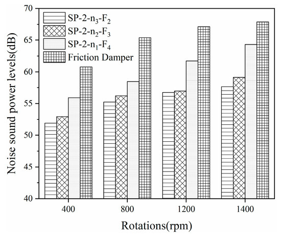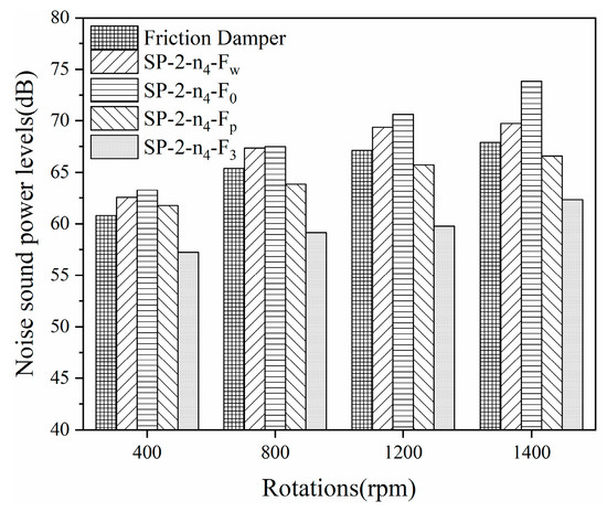 As previously mentioned in Section 4.3.4, the three specimens SP-2--F2, SP-2--F3 and SP-2--F4 show better damping effects. Figure 25 shows the noise sound power levels using these three specimens and the solid-state friction type. It is evident from the comparison that the noise value using the three specimens has undergone different levels of attenuation, with a noise reduction range of 3.57–10.38 dB. Specimen SP-2--F2 achieves the most significant noise reduction effect, where the noise level was reduced by 8.85 dB, 10.14 dB, 10.38 dB, and 10.24 dB relative to the solid-state friction damper at the four-speed stages, thus demonstrating that the fluid damper can significantly reduce noise with damping vibration.