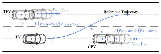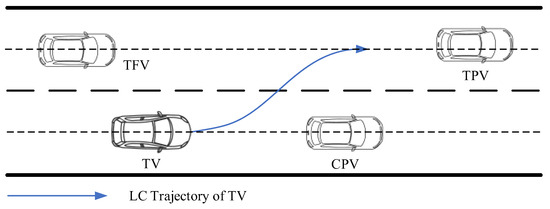 The typical LC scenario for the ICVs in a multi-lane highway environment is illustrated in Figure 1. TV is the target vehicle intending to change lane, CPV is the current-lane preceding vehicle, TPV is the target-lane preceding vehicle, and TFV is the target-lane preceding vehicle.
