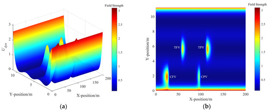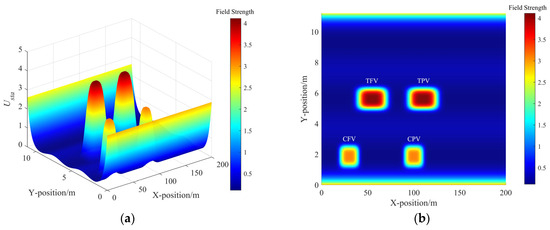 The lowest risk for TV is when it remains on the lane centerline, while the highest risk is when it crosses the lane line [42]. The lane centerline risk field does not change over time and is only related to the vehicle’s longitudinal position. Therefore, the lane centerline risk field is:
