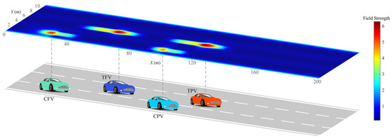 First, the smaller the relative distance between the TV and adjacent vehicles, the greater the possibility of collision and the stronger the static risk field. Second, considering the actual motion characteristics of vehicles, their traveling direction is limited; that is, the longitudinal speed of vehicles is usually much smaller than the lateral speed [43]. Therefore, laterally, the static risk field of adjacent vehicles has a greater impact range, while longitudinally, the impact range of the static risk field is smaller. In addition, taking into account the influence of the adjacent vehicles’ dimensions, the larger the vehicle size, the relatively higher the risk it poses.