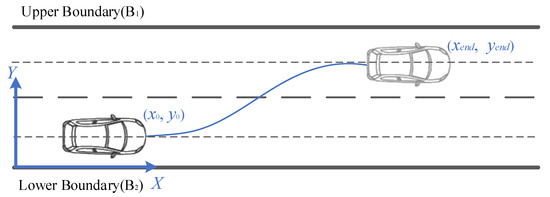 Highways are a typical structured road, characterized by their rigorous lane demarcations and stringent traffic regulations. These elements collectively establish clear boundaries and constraining conditions for vehicle operation, thereby imparting a distinct regularity and controllability to vehicle movement when traveling on highways. The upper and lower boundaries of the road are defined as B1 and B2, respectively. The coordinate system is established with the starting point of the target lane as the origin, creating a local rectangular coordinate system as shown in Figure 6. The X direction is defined as the forward direction along the road, which corresponds to the vehicle’s travel direction. The Y direction is perpendicular to the X direction. The coordinates (x0, y0) represent the position of TV at the beginning of the LC process, and the coordinates (xend, yend) represent the vehicle’s position at the end of the LC process.