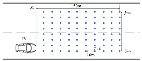In order to avoid creating an infinite number of LC trajectories and minimize computational resources, it is necessary to discretized sample the LC space. Based on the research about the LC duration and distance, the LC distance is primarily concentrated within 150 m, and the LC duration is concentrated in 3~10 s [46,47,48]. Therefore, the sampling points are taken at an interval of ΔX = 10 m in the X direction and at an interval of Δt = 1 s in the Y direction. The sampling region ahead of the TV is shown in Figure 7. In the local rectangular coordinate system constructed in Figure 6, the length of the LC trajectory planning area is set to 150 m.