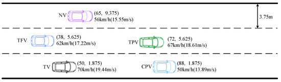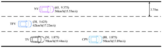 In scenario 2, apart from the TFV decelerating from 0~4 s with aTFV = −1.5 m/s2, the initial motion states of the other vehicles are identical to those in scenario 1, as shown in Figure 9.