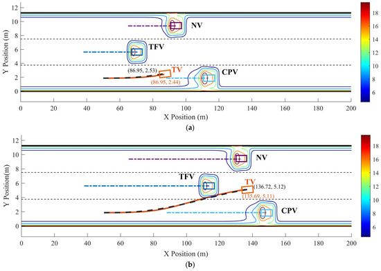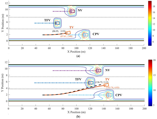 In scenario 4, the TFV and CPV exhibit variable acceleration patterns while considering the presence of TPV. Combining Figure 18 and Figure 19, the optimized LC trajectory has been significantly modified in comparison to the reference trajectory. Specifically, at t = 1 s, aTFV,x = −0.7 m/s2, aTFV,y = −0.2 m/s2, aCFV = −1.1 m/s2. At this point, as both TFV and CPV have initiated deceleration, TV promptly adjusts its trajectory in a timely manner based on the real-time velocity and acceleration of TFV and CPV. After predicting the positions of TFV and CPV for the next moment, TV’s trajectory is optimized accordingly. Influence by aTFV,y, TFV begins to approach TV in the Y direction. Consequently, the position of TV in the Y direction starts to shift downward compared to the reference trajectory. The maximum downward offset of the optimized trajectory on the y–x curve is approximately 0.6 m. During the interval [4 s, 6 s], with aTFV,x = −1.0 m/s2, aTFV,y = 0.32 m/s2, TFV starts moving away from TV in the Y direction. Compared to the previous segment, the optimized trajectory in this segment exhibits a reduced downward offset in the Y direction. At this point, the downward offset of the optimized trajectory on the y–x curve is approximately 0.4 m. Moreover, the distribution of the risk field in Figure 18 indicates that the risk associated with the optimized trajectory is significantly reduced compared to the reference trajectory. As indicated in Figure 19, TV’s lateral velocity vx remains relatively constant with vx ≈ 19.44 m/s, ax ≈ 0. The longitudinal velocity vy ranges between 0 and 0.98 m/s, accelerating initially within the interval [0, 3.6 s], then decelerating after 3.6 s, indicating TV successfully enters the target lane after 3.6 s.
