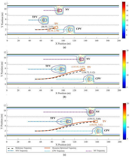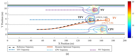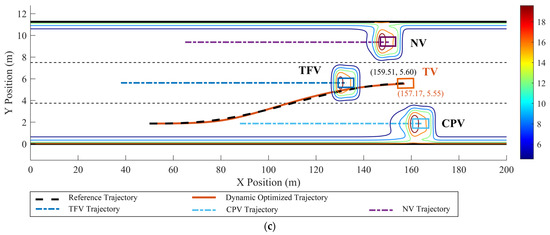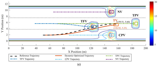 Dynamic optimized LC trajectory planning result and MDRF distribution in scenario 3: (a) t = 2 s, (b) t = 4.5 s, and (c) t = 5.6 s.
