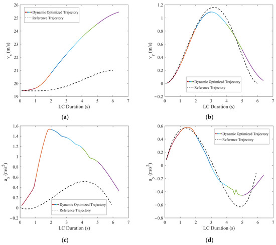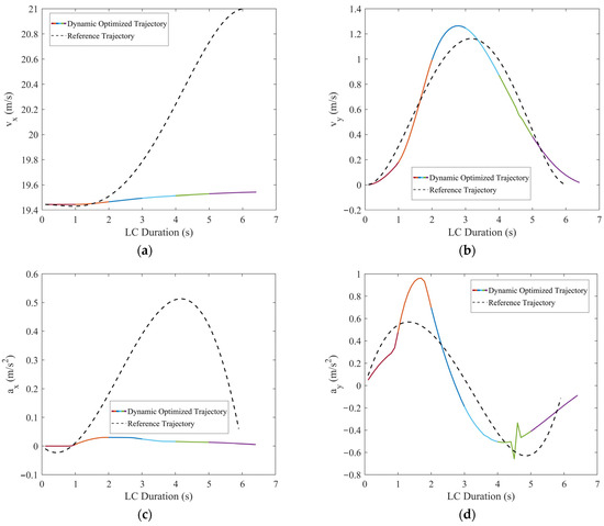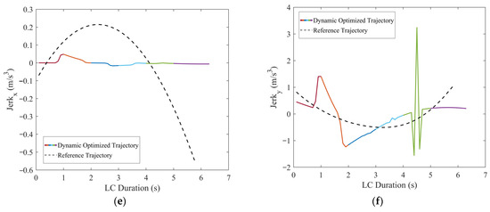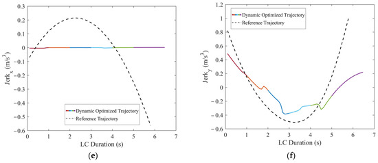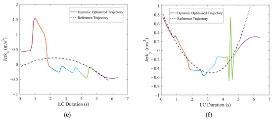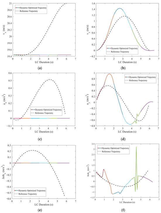 Comparisons of the motion parameters between dynamic optimized LC trajectory and reference LC trajectory for scenario 4: (a) Comparison of lateral velocities (vx); (b) comparison of longitudinal velocities (vy); (c) comparison of lateral accelerations (ax); (d) comparison of longitudinal accelerations (ay); (e) comparison of lateral jerk (Jerkx); and (f) comparison of longitudinal jerk (Jerky).