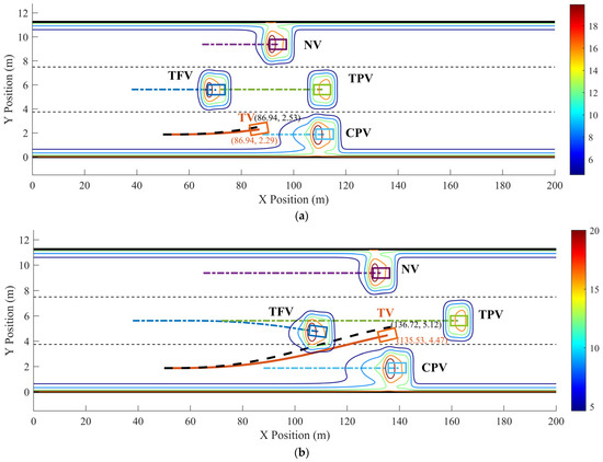 The dynamic risk field describes the evolution patterns of the potential risk between TV and the moving adjacent vehicles. It takes into account the relative distance, relative velocity, and approaching direction between TV and adjacent vehicles. As the relative distance between vehicles decreases, the risk of collision increases. Furthermore, there is a nonlinear acceleration in the rate of risk rise with decreasing distance; the rate of risk increase shows a nonlinear acceleration. In real traffic environments. The dynamic speed and approach direction of adjacent vehicles significantly affect the LC risk. For instance, the rate of increase in collision risk is faster if the following vehicle approaches at a higher speed than the leading vehicle. Conversely, the rate of decrease in collision risk is also faster if the leading vehicle accelerates away at a speed higher than the following vehicle [45]. Similarly, all other adjacent vehicles constantly changing positions during the LC process will have similar and complex interactive effects on TV.