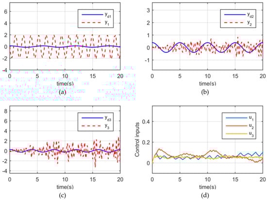 The ASMC simulation results of 3−DOF. (a) Trajectory tracking y1. (b) Trajectory tracking y2. (c) Trajectory tracking y3. (d) Control inputs u1−u3.