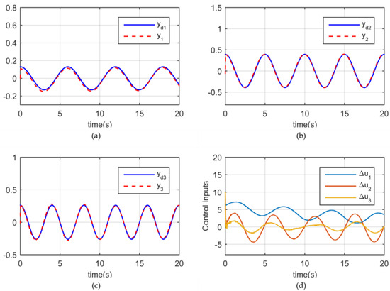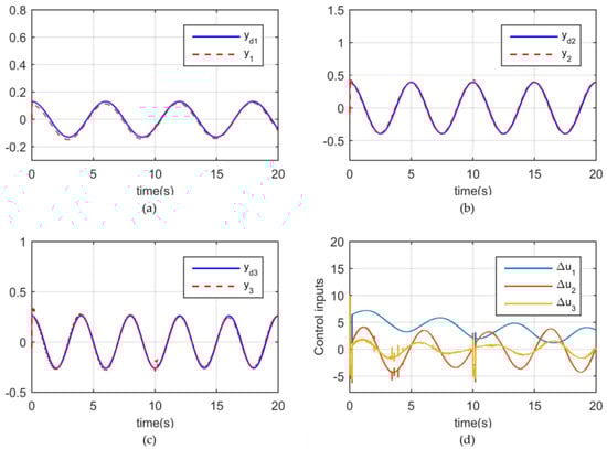 The FFDL−MFACC simulation results of 3−DOF. (a) Trajectory tracking y1. (b) Trajectory tracking y2. (c) Trajectory tracking y3. (d) Control inputs ∆u1−∆u3.