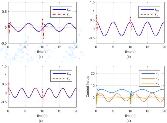 The FFDL−MFACC with the external payload torque simulation results of 3−DOF. (a) Trajectory tracking y1. (b) Trajectory tracking y2. (c) Trajectory tracking y3. (d) Control inputs ∆u1−∆u3.