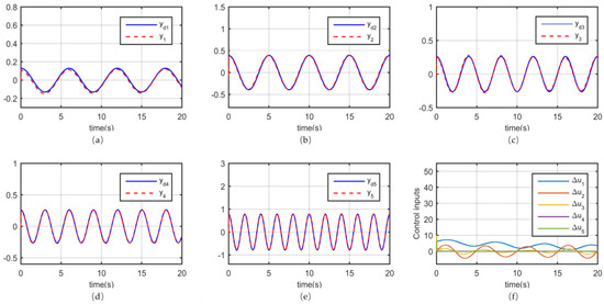 The FFDL−MFACC simulation results of 5−DOF. (a) Trajectory tracking y1. (b) Trajectory tracking y2. (c) Trajectory tracking y3. (d) Trajectory tracking y4. (e) Trajectory tracking y5. (f) Control inputs ∆u1−∆u5.