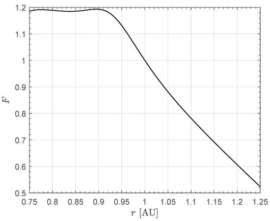 which has been introduced here to obtain a more compact expression of . The meaning and values of the terms appearing on the right-hand side of Equation (1) are indicated and discussed in the two appendices, while the variation in the auxiliary function F with r is schematized in Figure 1. Note that when the solar distance is equal to 1 astronomical unit, that is, when . Recall that is the unit vector that defines the direction of the thrust given by the miniaturized electric thruster, while is the Sun-CubeSat unit vector which coincides with the direction of the thrust given by the Sun-facing (photonic) solar sail. Therefore, the control terms in Equation (1) are the unit vector and the throttle function , so that there are three scalar control variables (recall that ).