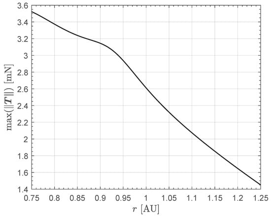 According to Equation (1), the maximum value of the HPS-induced thrust magnitude is obtained when and , that is, when the solar electric propulsion system gives an outward radial thrust with a full throttle level. In this case, one has
