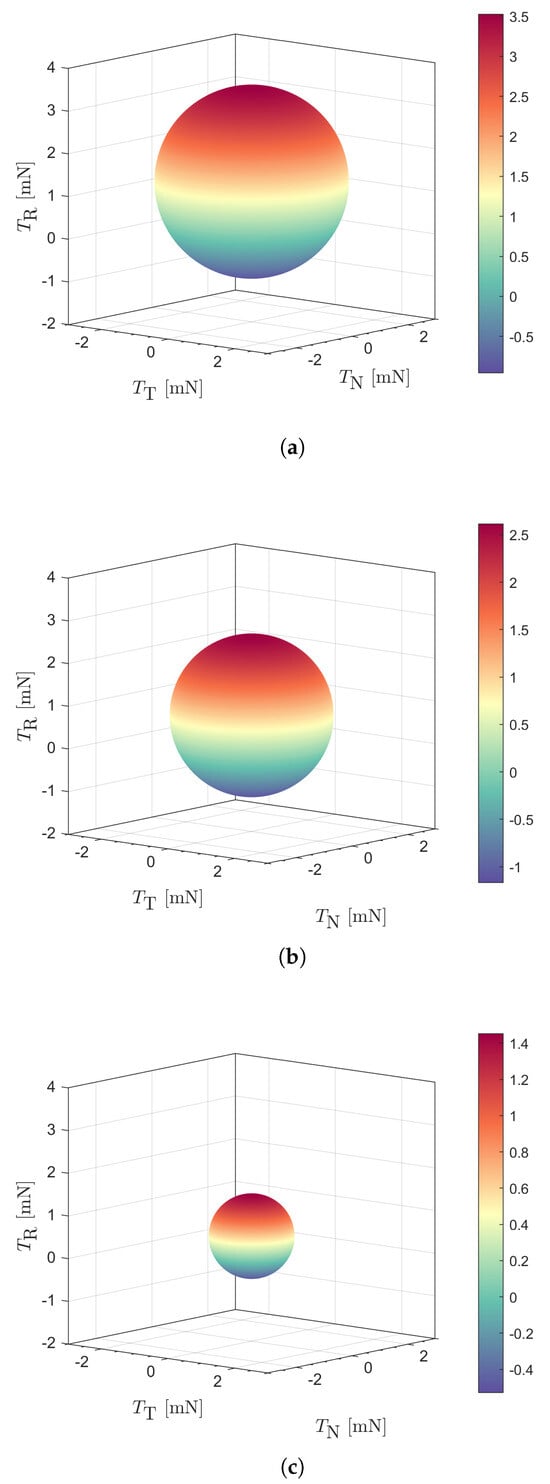 Thrust bubble (when ) as a function of the Sun-CubeSat distance r. The ticks in the color bar are in millinewtons. (a) Case of ; (b) Case of ; (c) Case of .