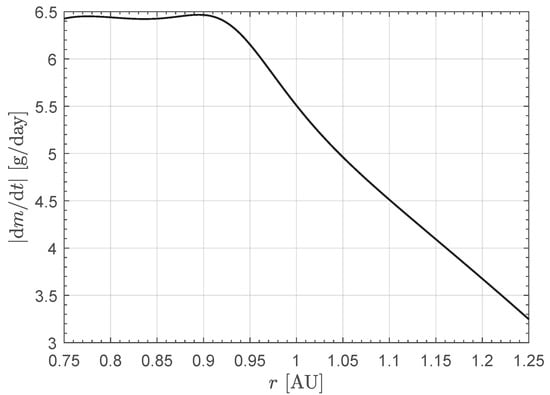 The variation in the CubeSat mass during the flight is due exclusively to the propellant expelled by the miniaturized electric thruster whose specific impulse is a function of the solar distance r; see the lower part of Figure A2. Bearing in mind the mathematical model described in Appendix A, the time variation in the mass can be written as
