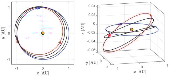 Ecliptic projection and isometric view of the rapid transfer trajectory towards asteroid 99942 Apophis when the initial CubeSat mass is . The z-axis of the isometric view is exaggerated to highlight the three-dimensionality of the trajectory. Black line → CubeSat transfer trajectory; blue line → Earth’s orbit; red line → asteroid’s orbit; filled star → perihelion; blue dot → starting point; red square → arrival point; orange dot → the Sun.