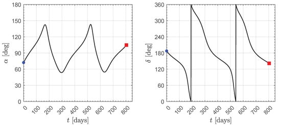 Time variation in the thrust angles and along the rapid transfer trajectory towards asteroid 99942 Apophis when the initial CubeSat mass is . Blue dot → starting point; red square → arrival point.