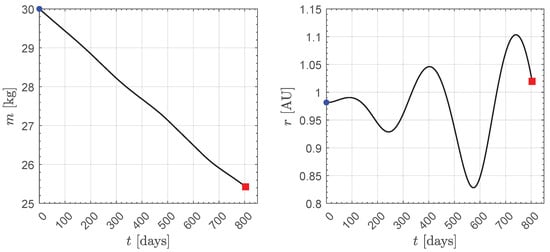 Time variation in the mass m and solar distance r along the rapid transfer trajectory towards asteroid 99942 Apophis when the initial CubeSat mass is . Blue dot → starting point; red square → arrival point.