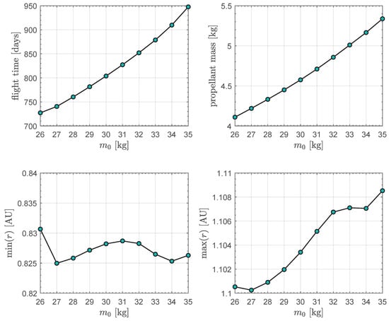 In this reference case, the miniaturized electric thruster gives always the maximum thrust magnitude (i.e., during all the flight), the rapid transfer does not contain any coasting arc and requires a flight time of about , while the required propellant mass is slightly less of . Finally, Figure 7 shows the time variation in the CubeSat mass and the distance from the Sun during the transfer. Note that the solar distance value remains within the allowed range throughout the interplanetary flight. The numerical procedure has been repeated by varying the initial CubeSat mass in the range , with a step of , to perform a sort of parametric study of the transfer performance as a function of . The results are shown in Figure 8, which clearly indicates that the transfer performances, in terms of both the flight time and the required propellant mass, depend on the value of the initial CubeSat mass. In this respect, a reduction in the value of of about (with respect to the reference value of ) allows the flight time to be reduced of roughly .