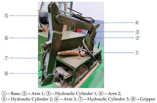 The modeling of a certain demining robotic manipulator was conducted using SolidWorks2018 software, as depicted in Figure 1. The demining robotic manipulator is a four-degree-of-freedom system. Arm 1 is connected to the base, which provides rotational drive for Arm 1. Arm 1 is connected to Arm 2, which is powered by hydraulic cylinder 1. Arm 2 is connected to Arm 3, powered by hydraulic cylinder 2. Arm 3 is connected to the gripper, which is actuated by hydraulic cylinder 3. The gripper part can rotate around its axis. Since the focus of this paper is on the working conditions and control strategies of the three hydraulic cylinders, the rotational motion of the gripper is neglected, thereby simplifying this feature.