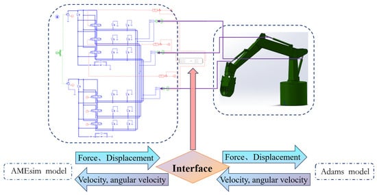 In the joint simulation task, establishing a simulation interface is the core link connecting different simulation software (AMEsim2019.2 and Adams2019), and it is the key channel for data interaction between the two different software. In Adams, the input and output state variables were set: the input variables involved the dynamic characteristics of the piston rod’s center of mass, which were velocity and acceleration; the output included the resultant force and displacement experienced by this center of mass. Then, in AMEsim, a connection compatible with the Adams-Cosim simulation interface was constructed to achieve joint simulation of the mechanical and hydraulic systems. As shown in Figure 4, the creation of this interface is the foundation for ensuring a seamless connection in the simulation process.
