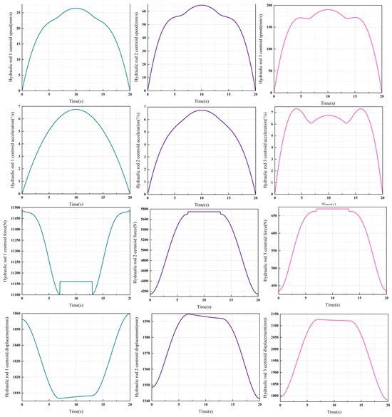 In AMEsim, the simulation period is set to 20 s, with a simulation step size of 0.02 s, and when performing joint simulation with Adams, the data synchronization interval is set to 0.001 s. After the simulation is completed, parameter changes in the hydraulic rod’s center of mass can be extracted from the AMEsim hydraulic model. The center of mass itself is not subject to forces; however, for the convenience of analyzing its motion and parameter changes in this paper, they are considered as being applied to the center of the hydraulic rod, as shown in Figure 7.