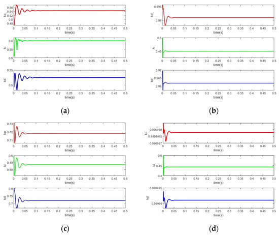 (a) BP neural network, (b) genetic algorithm PID controller, (c) whale optimization algorithm, (d) particle swarm optimization algorithm BP neural network PID controller Kp, Ki, Kd parameter change.