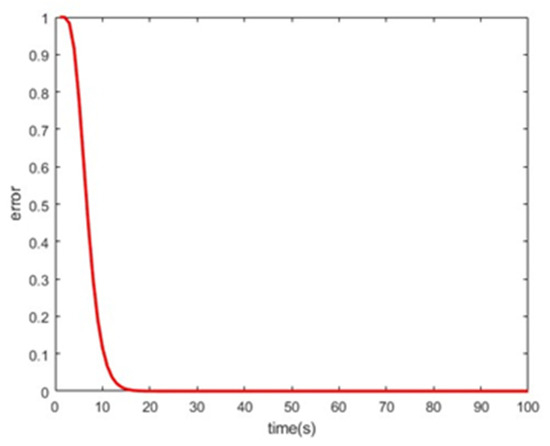 From the simulation results in Figure 14 and Figure 15, it can be observed that the three control parameters of the PSO-BP neural network reach a stable state before 0.05 s. This is because, through training, the neural network can predict the system response for given PID parameters. Subsequently, the PSO algorithm is applied to the optimization process, where each particle represents a set of potential PID parameters. The PSO algorithm iteratively updates the particle positions, that is, the PID parameters, by simulating the behavior of swarm intelligence to find the parameter combination that maximizes the predictive performance of the BP neural network. The WOA algorithm-optimized BP neural network and the BP neural network PID controller are slightly slower. To fully observe the step response curves of the four methods, the time was set to 100 s. Figure 15 shows that under the same step function input, the PSO-BP neural network control can reach a stable state at 14 s, with a fast response and almost no overshoot. It has the best overall performance among the four. Figure 16 is the error curve of the control method proposed in this paper, PSO-BP+PID. The curve shows that at time 0 s, the error is at its maximum of 100%. As the control method enters the adjustment time, the error gradually decreases, reaching 0 at 14 s, and remains unchanged thereafter. This reflects the adjustment time and the fluctuation after adjustment of the PSO-BP+PID in response to a unit step function. The error curve and the response curve can be considered as an inverse process.