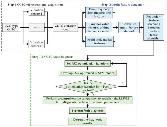 This study extracts multi-dimensional features of OLTC vibration signals from four perspectives: time-domain features, frequency-domain features, time-frequency matrix energy features, and multi-scale modal features. A PSO-optimized LSSVM model is then utilized for fault diagnosis. The specific process of the proposed method is illustrated in Figure 1, with the main steps as follows:
