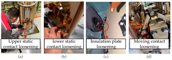 Figure 5 illustrates the setting of four fault conditions. In Figure 5a, the fault of the upper stationary contact loosening is set by loosening the screws of the upper stationary contact. In Figure 5b, the fault of the lower stationary contact loosening is set by loosening the screws of the lower stationary contact. In Figure 5c, the fault of the insulation plate loosening is set by loosening the screws of the insulation plate. In Figure 5d, the fault of the moving contact loosening is set by cutting the spring that connects the moving contact. Data from five conditions were collected, including normal, upper stationary contact loosening, lower stationary contact loosening, insulation plate loosening, and moving contact loosening conditions.